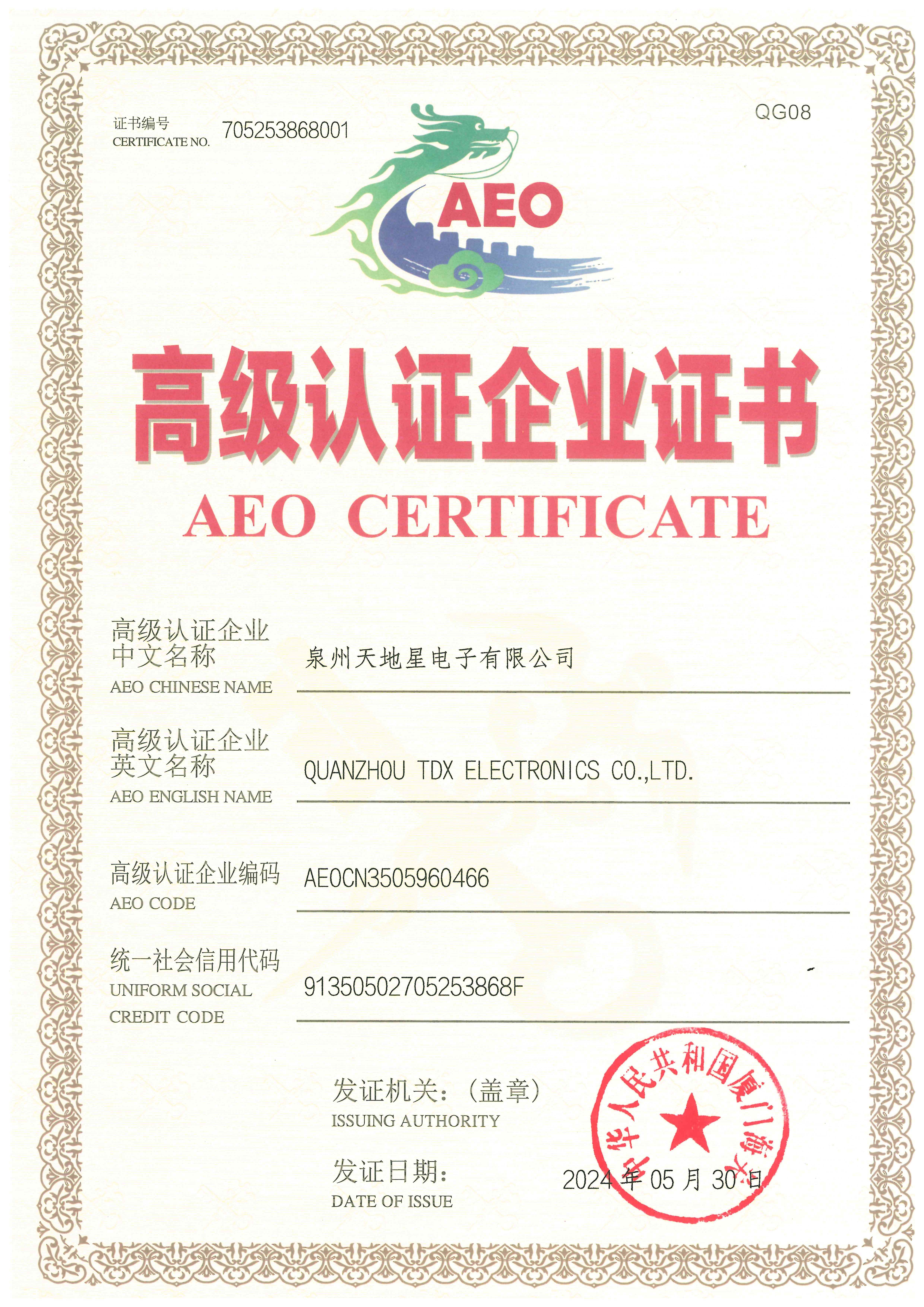 AEO海關(guān) 高級認證企業(yè)證書